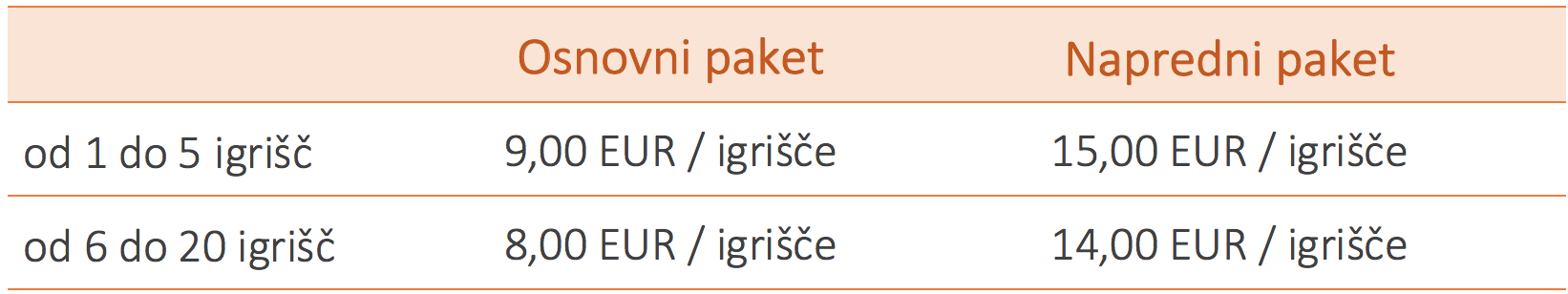 - napredni paket 15,00 EUR za eno igrišče, za 6 ali več igrišč pa 14,00 EUR na igrišče.