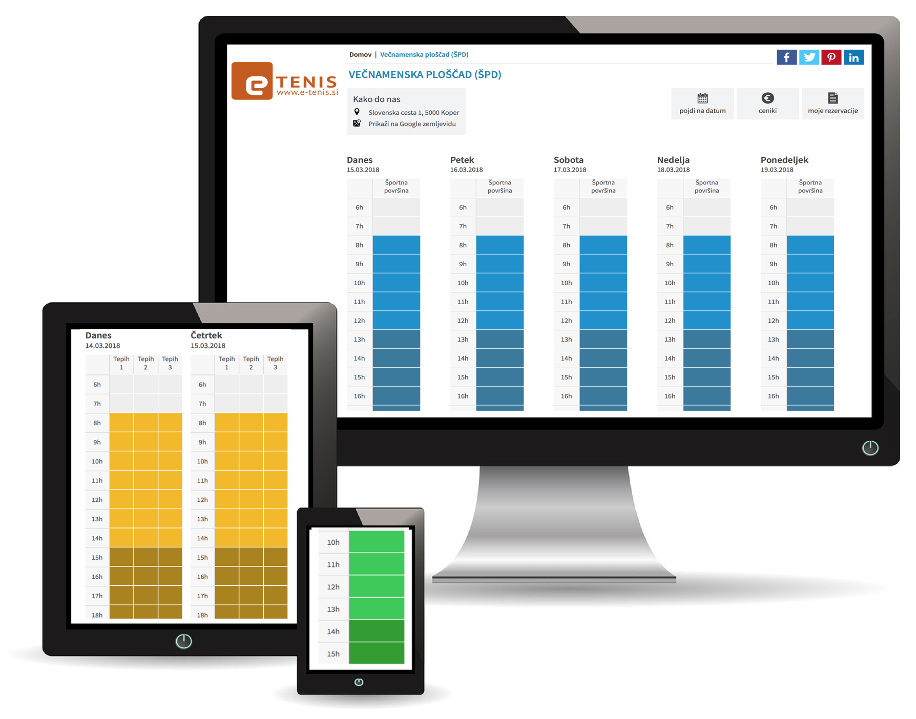 V koledarju lokacije so vidna vsa igrišča in prosti termini. Po kliku na izbran termin (ali ob potegu čez več ur) uporabnik izvede rezervacijo.
